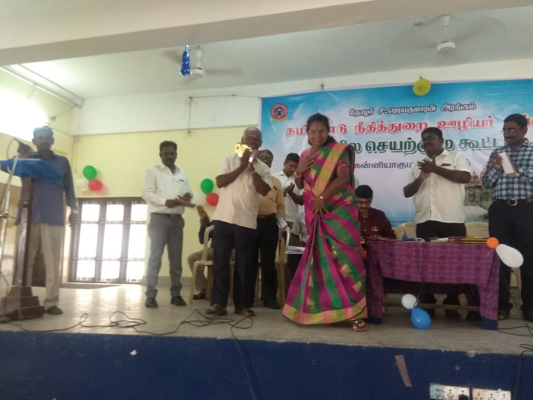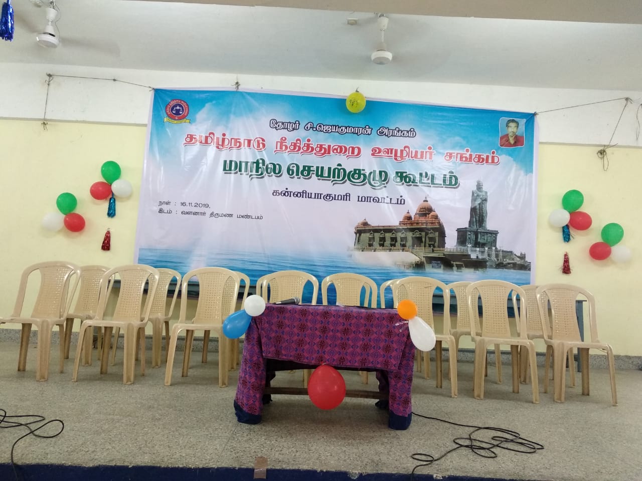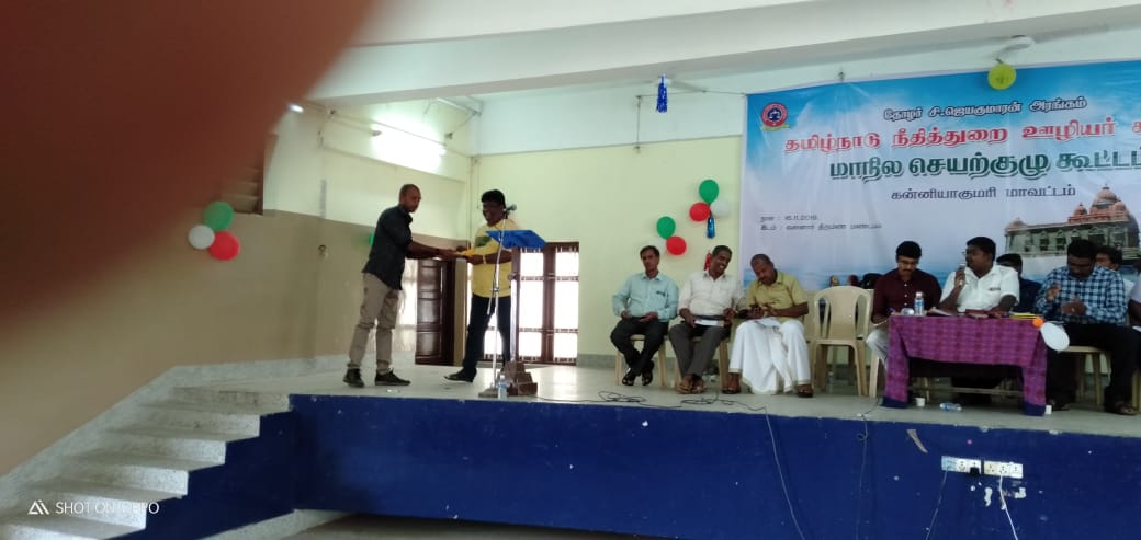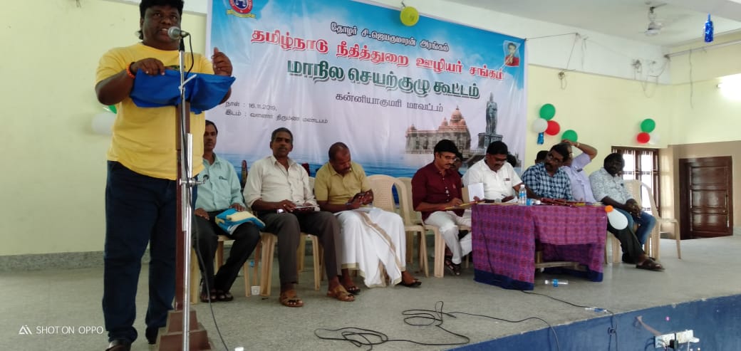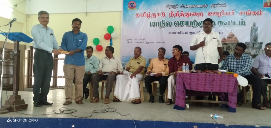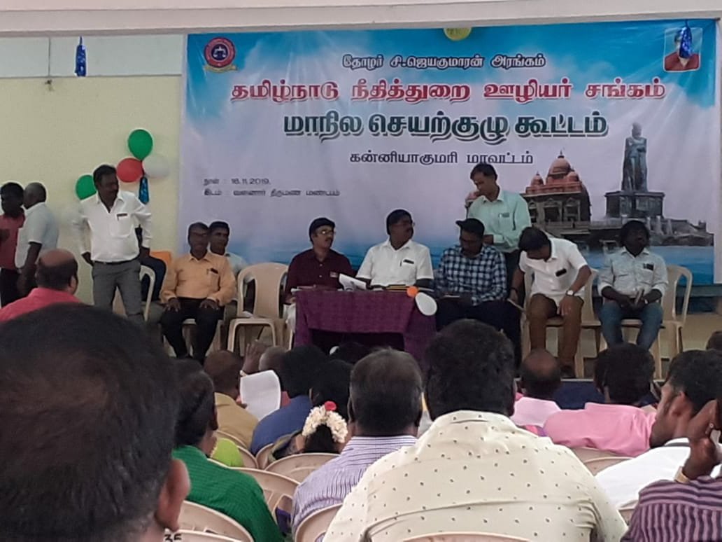 தமிழ் நாடு நீதித்துறை ஊழியர் சங்க மாநில செயற்குழு கூட்டம் 16.11.2019 சனிக்கிழமை நாகர்கோவில் நீதிமன்ற வளாகத்தின் அருகே உள்ள வளனார் திருமண மண்டபத்தில் வைத்து காலை 10 மணியளவில் மாநில தலைவர் தோழர். செந்தில் குமார் அவர்களால் கொடியேற்றி துவங்கி வைக்கப்பட்டது. அதன் பின்னர் *நீதித்துறையில் பணியாற்றி காலமான தோழர்களுக்கு மலர் அஞ்சலி செலுத்தப்பட்டு சரியாக 10.30 மணிக்கு கன்னியாகுமரி மாவட்ட நீதித்துறை ஊழியர் சங்க செயலாளர் திரு. மங்கை மணவாளன் அவர்களால் வரவேற்புரை வழங்கி தமிழ் நாடு நீதித்துறை ஊழியர் சங்க *மாநில தலைவர், பொதுச் செயலாளர் மற்றும் மாநில நிர்வாகிகளுக்கு நினைவுப் பரிசு வழங்கி வரவேற்கப்பட்டது. நிகழ்ச்சியில் சிறப்பு விருந்தினராக அரசு ஊழியர் சங்க மாநில துணை தலைவர் தோழர். வெங்கடேசன், நமது முன்னாள் மாநில தலைவர் தோழர். கருணாகரன், *முன்னாள் மாநில துணை தலைவர் மண்ணின் மைந்தர் தோழர். வேதமணி, கன்னியாகுமரி மாவட்ட நீதித்துறை ஊழியர் சங்க முன்னாள் செயலாளர் தோழர். லெக்ஷ்மண பெருமாள் ஆகியோருக்கும் நினைவு பரிசு வழங்கி சிறப்பிக்கப்பட்டது. கூட்டத்தில் பொருளாளர் அறிக்கை வாசிக்கப்பட்டு, எழுத்து மூலமாக வழங்கப்பட்ட பொதுச் செயலாளர் அறிக்கையின் மீது ஒவ்வொரு மாவட்டத்திலிருந்து வந்த மாவட்ட நிர்வாகிகள் விவாதம் மேற்கொண்டனர். *மொத்தம் 25 மாவட்டங்கள் விவாதத்தில் கலந்து கொண்டு சிறப்பித்தனர். நிறைவாக மாவட்ட நிர்வாகிகளின் விவாதங்களின் அடிப்படையில் மாநில மையத்தால் தீர்மானங்கள் பல நிறைவேற்றப்பட்டன.