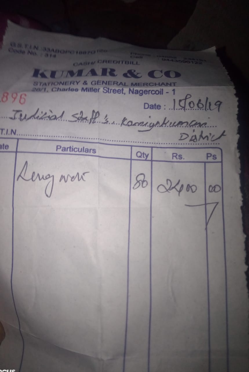 01-07-2019 மாலை 7 மணியளவில் ஆசாரிப்பள்ளம் கன்கார்டியா பள்ளி மைதானத்தில் அமைந்துள்ள ஆதரவற்ற சிறுவர்கள் இல்லத்திற்கு சென்று அவர்களுக்கு தேவையான ரூபாய் 2400/- மதிப்பிலான 80 நோட் புத்தகங்கள் வழங்கப்பட்டது. நிகழ்வில் முதன்மை மாவட்ட நீதிமன்ற தலைமை எழுத்தர் திரு மணிமுத்து, உதவியாளர் திரு. அபிஷேக், ஜெராக்ஸ் ஆப்பரேட்டர் திரு. சுப்பிரமணி ஆகியோர் கலந்து கொண்டனர்.